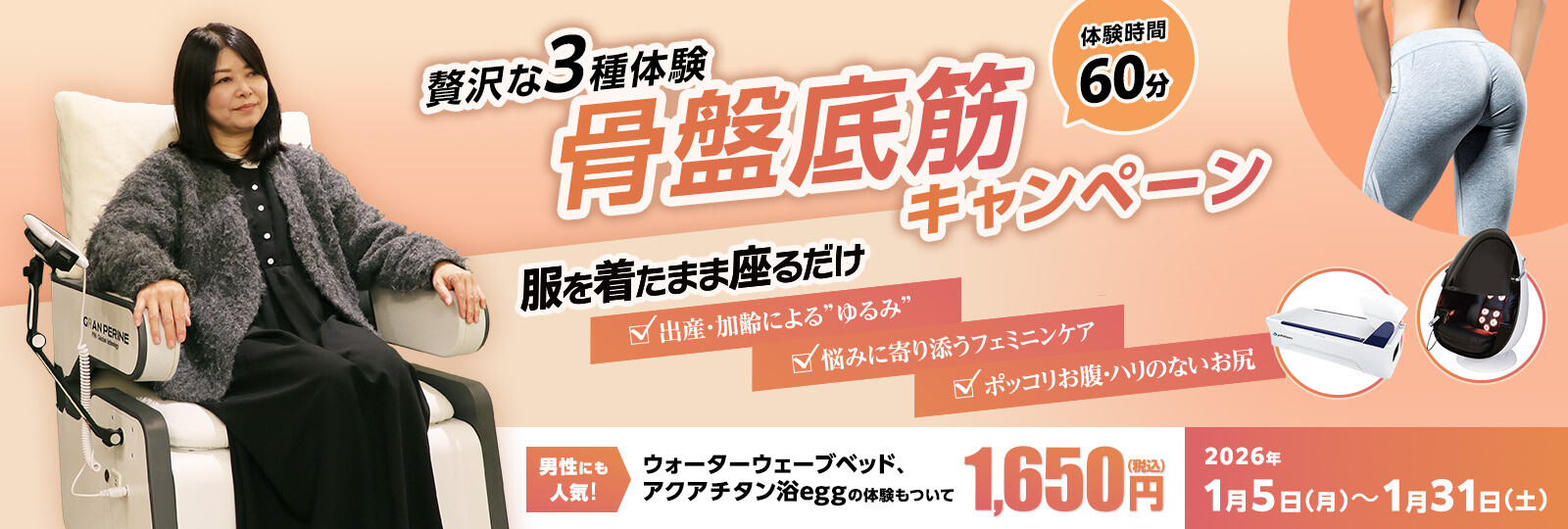 2026年1月5日(月)~31日(土)の期間、IPサロン東銀座にて、『贅沢な3種体験!骨盤底筋キャンペーン』を開催いたします。